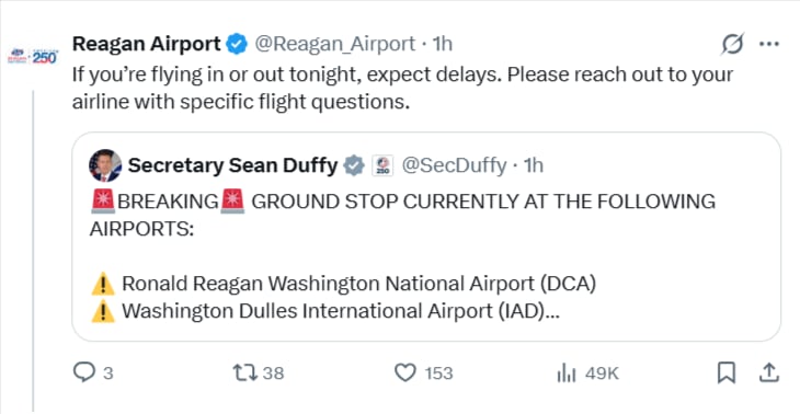 La Administración Federal de Aviación (FAA) no dudó en tomar medidas drásticas. Los aeropuertos afectados incluyen el Ronald Reagan Washington National, el Washington Dulles International, el Baltimore-Washington International y el Andrews Air Force Base.