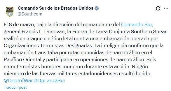 Lo que había ocurrido era otro capítulo en la guerra silenciosa que Estados Unidos libra contra el narcotráfico en alta mar. Una operación que terminó con seis narcotraficantes muertos y una lancha destruida en aguas internacionales del Pacífico.